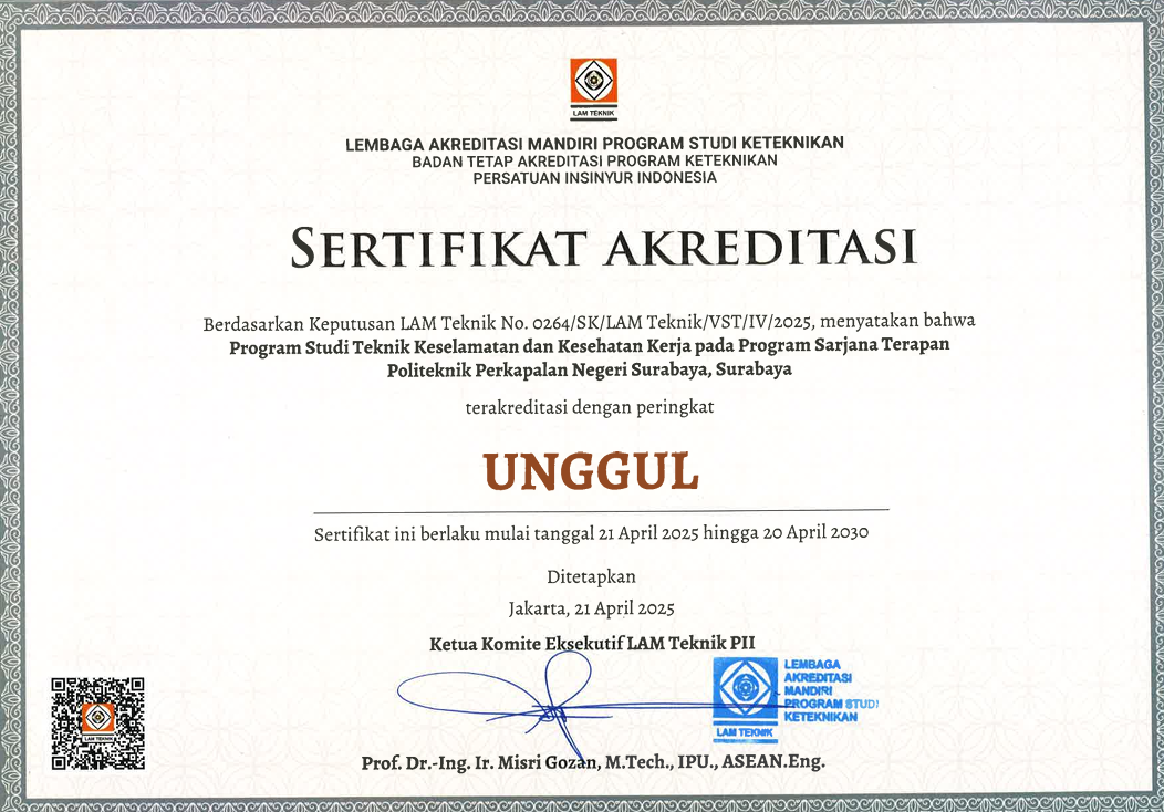 Program Studi Teknik Keselamatan dan Kesehatan Kerja mendapat akreditasi A untuk pertama kali berdasarkan SK BAN PT No.004 / BAN / PT / Ak / VII / Dpl / IV / VII / 2010 tanggal 9 Juli 2010 sampai dengan 9 Juli 2015. Periode berikutnya mendapat akreditasi A berdasarkan SK BAN-PT No. 1121 / SK / BAN-PT / Akred /Dpl-IV / X / 2015 tanggal 31 Oktober 2015 sampai dengan 31 Oktober 2020. Selanjutnya Prodi K3 juga mendapatkan akreditasi A berdasarkan SK BAN-PT No.6876 / SK / BAN-PT / Ak-PPJ / ST / XI / 2020 tanggal 3 Nopember 2020 dan berlaku hingga tahun 2025. Dan, saat ini Prodi K3 mendapatkan akreditasi UNGGUL berdasarkan SK LAM Teknik No. 0264/SK/LAM Teknik/VST/IV/2025 tanggal 21 April 2025 sampai dengan 20 April 2030. Selain itu, Program Studi Teknik Keselamatan dan Kesehatan Kerja juga mendapat akreditasi dalam disiplin Occupational HSE Technology and similarly named Engineering Technology Programs pada tahun 2024 dari Indonesia Accreditation Board for Engineering Education (IABEE).