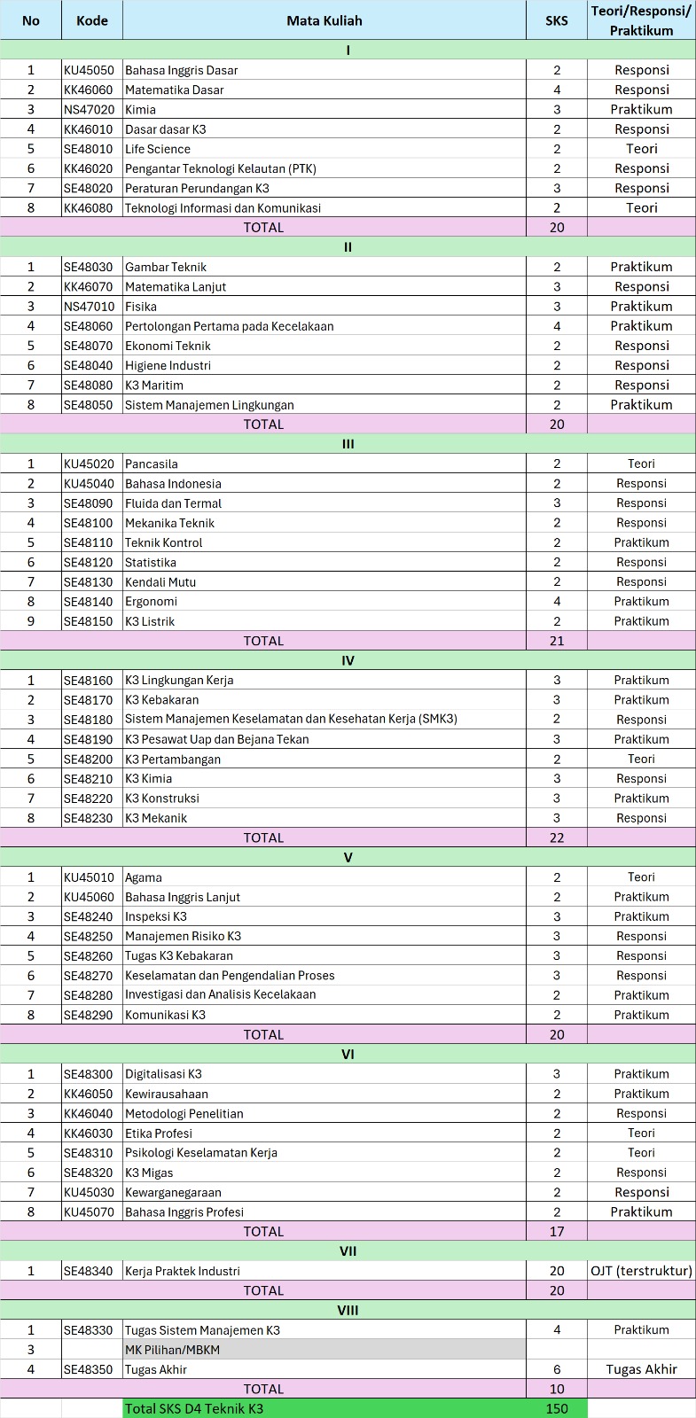 STRUKTUR KURIKULUM PRODI D4-TEKNIK KESELAMATAN DAN KESEHATAN KERJA BERDASARKAN KURIKULUM 2024